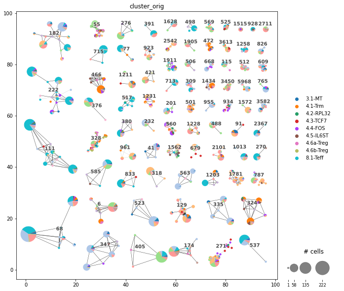 obs), the average of the cells in each dot is computed. When the network is colored by categorical variables (categorical columns fromobs), different categories per dot are visualized as pie chart.The layouting algorithm of