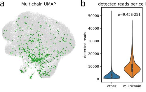 (a) UMAP plot of 96,000 cells from [WMdA+20] with at least one detected CDR3 sequence with multichain-cells (n=474) highlighted in green. (b) Comparison of detected reads per cell in multichain-cells and other cells. Multichain cells comprised significantly more reads per cell (p = 9.45 × 10−251, Wilcoxon-Mann-Whitney-test), supporting the hypothesis that (most of) multichain cells are technical artifacts arising from cell-multiplets ([IKK+16]).¶